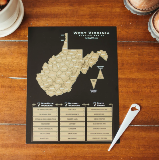 West Virginia has so much to offer. Have you visited all 55 counties? What about the highest and lowest points in the state? The WV scratch map is meant to be the perfect way to keep track of your adventures and take you to a couple unexpected places. Your West Virginia Adventure awaits.